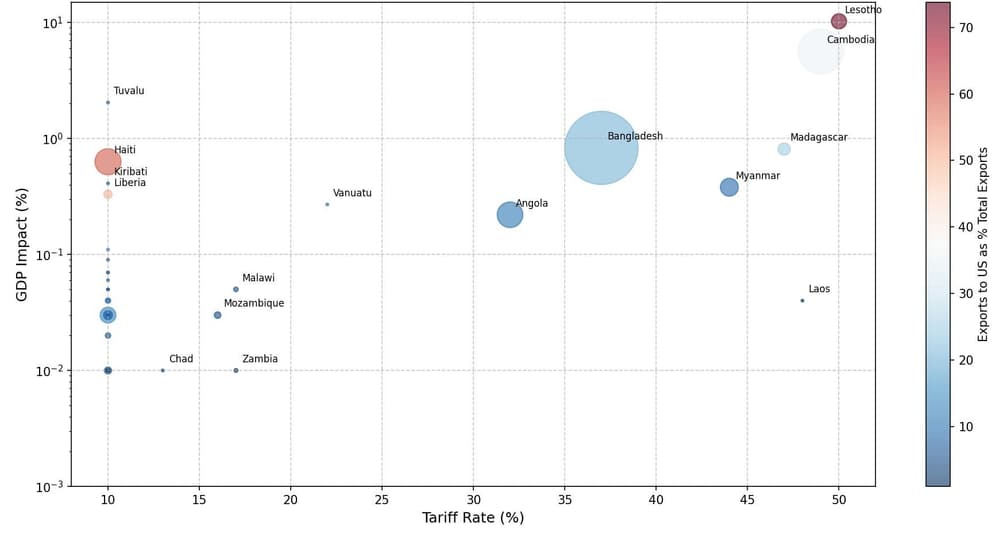 Note: The y-axis is the log of the estimated impact on GDP, in percentage terms. The x-axis is the % tariff rate faced by each LDC. The size of each bubble represents the log of total exports to the US, while the colour, from blue to red, signifies the proportion of the country’s exports going to the US.