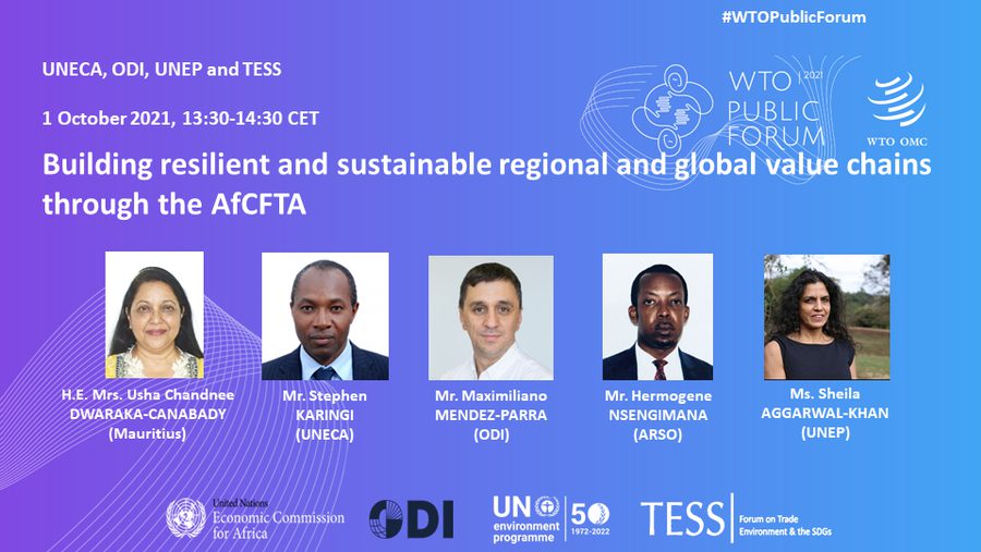 In this context, the United Nations Economic Commission for Africa (ECA) in collaboration with Overseas Development Institute (ODI), United Nations Environment Programme (UNEP) and TESS held a session on “Building resilient and sustainable regional and global value chains through the AfCFTA” during the WTO Public Forum 2021 “Trade Beyond COVID-19: Building Resilience.”