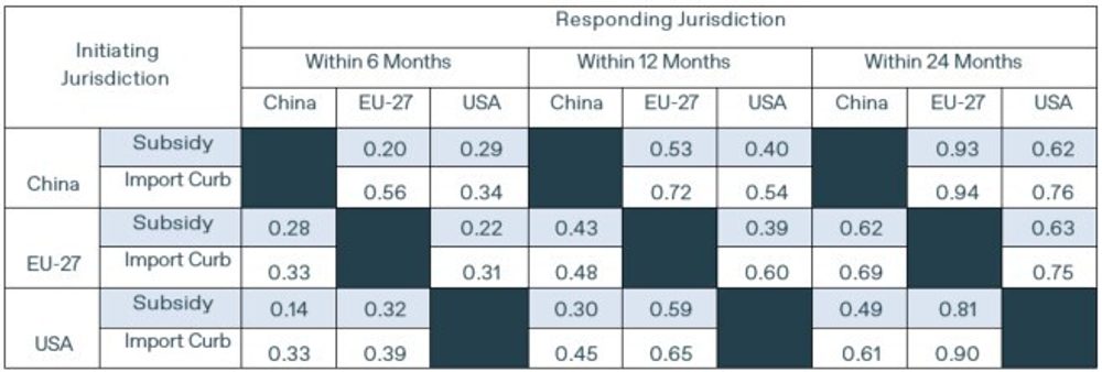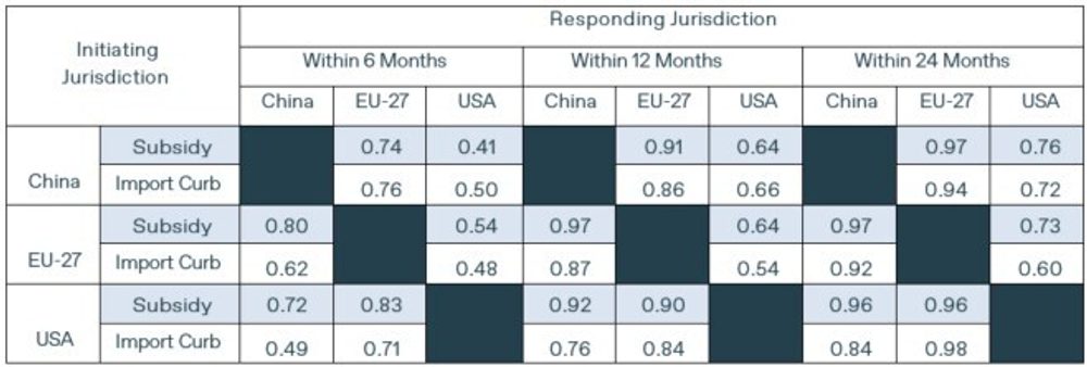 Table 1 reveals the likelihood of a subsidy response to another major player’s prior subsidy awards or import curbs. Within 2 years the EU-27 reacts almost every time to Chinese and US tariff and subsidy moves favouring local firms in net zero sectors. China reacts swiftly to EU subsidies but slower to US moves, particularly import curbs. Although the likelihood of a US subsidy response is lower, it still equals or exceeds 60% over a two-year horizon. Maybe these subsidy responses are a coincidence? (But what evidence would support that conclusion?) If not, concerns about tit-for-tat responses arise.