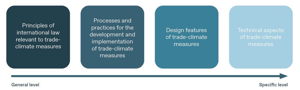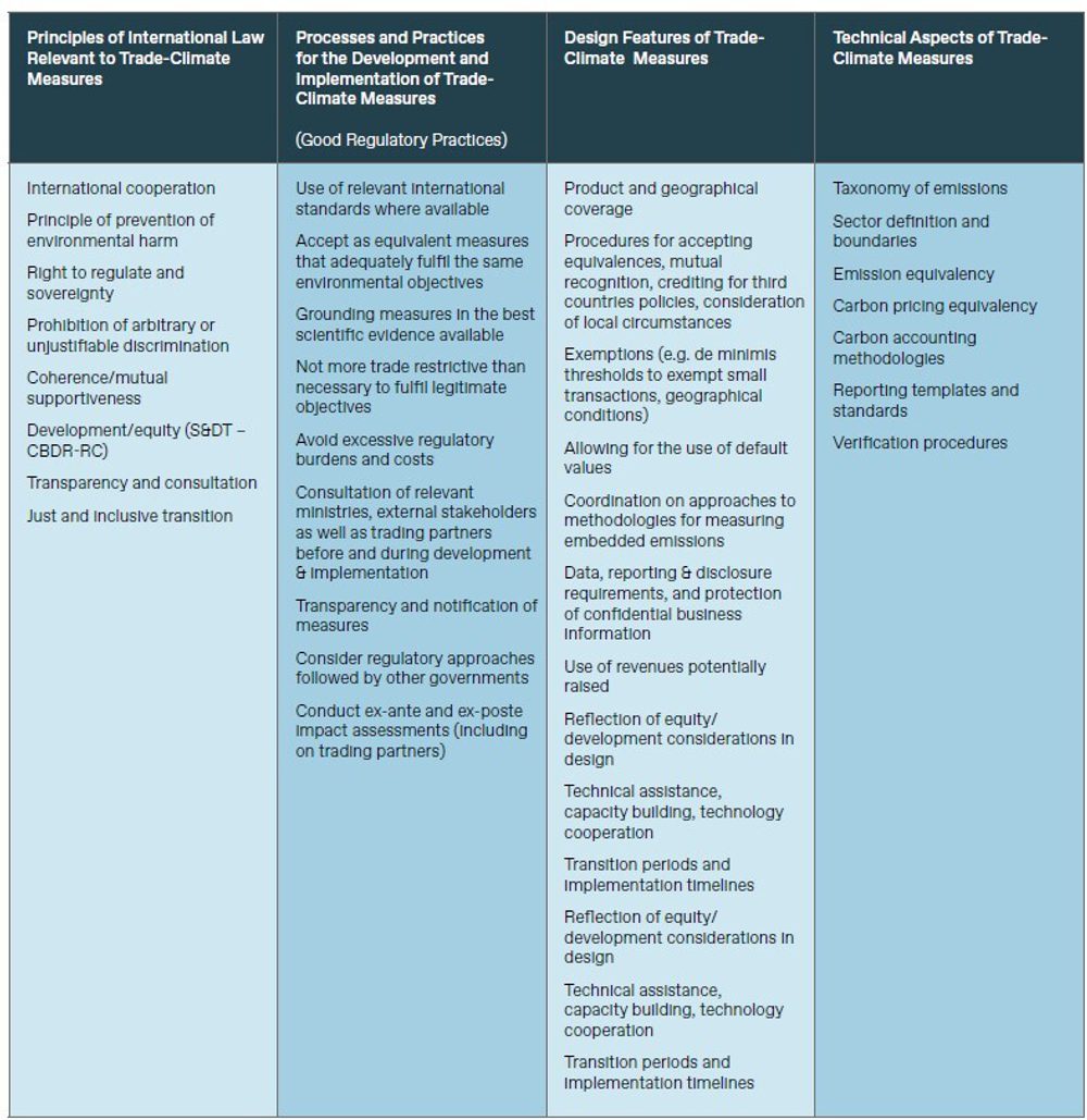 Regardless of the goal pursued, discussions on international cooperation on trade measures with climate objectives have mostly focused on four aspects: (i) principles of international law relevant to trade-climate measures; (ii) processes and practices for the development and implementation of measures (often referred to as “good regulatory practices”); (iii) design features of specific measures; and (iv) technical aspects.