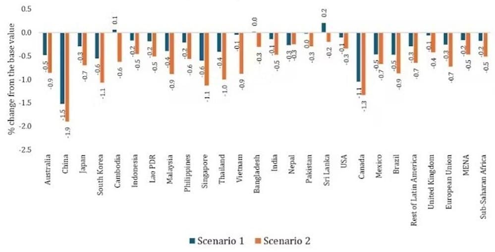 Under the second scenario, most emerging and developing economies would suffer modest GDP declines between 0.3% and 1%. Thailand (1%), Malaysia (0.9%), Brazil (0.9%), and Vietnam (0.9%) are the worst hit countries in this category.