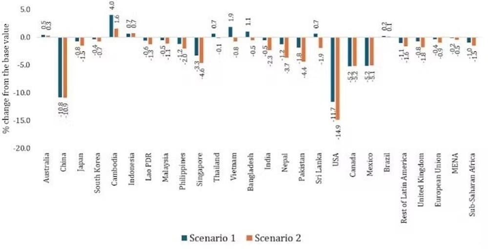 Bangladesh, Cambodia, Indonesia, Sri Lanka, and Vietnam may benefit in the first scenario due to a possible diversion of trade. These countries, which are known for having some of the lowest labour costs in the world, offer cheap alternatives for goods that US importers would previously have sourced from China.