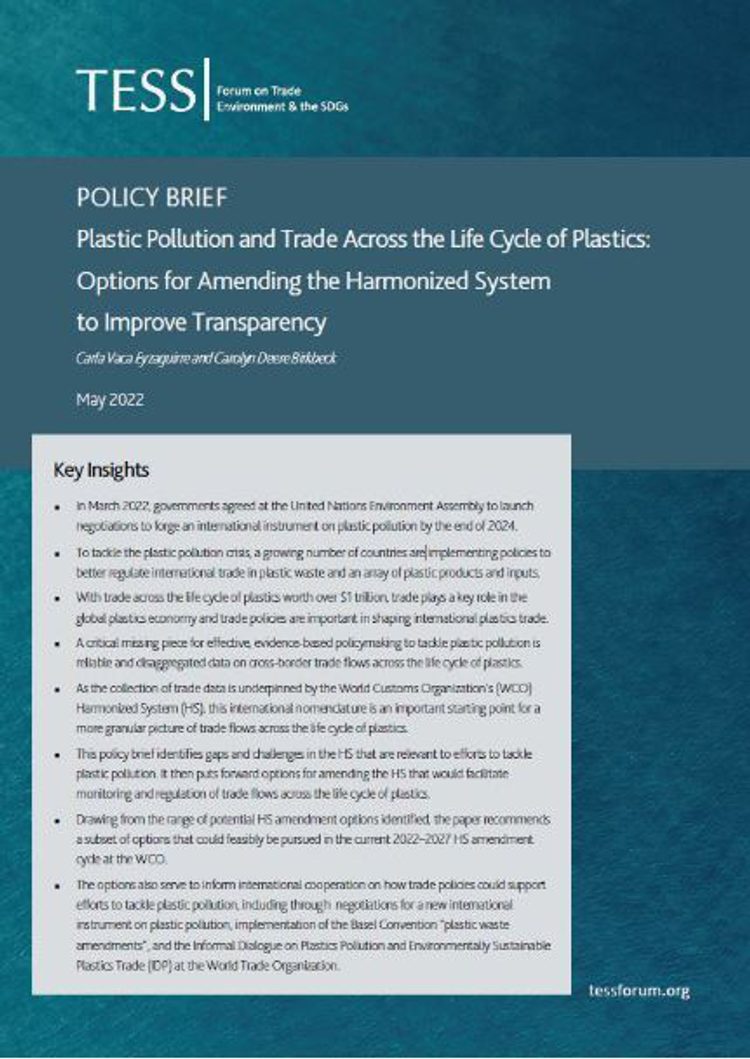 This policy brief identifies gaps and challenges in the World Custom Organization’s Harmonized Commodity Description and Coding System (HS) that are relevant to efforts to tackle plastic pollution. It then puts forward options for amending the HS that would facilitate monitoring and regulating trade flows across the life cycle of plastics. Drawing from the wide range of potential HS amendment options identified, the authors recommend a subset of options that could be pursued in the current 2022-2027 HS amendment cycle.