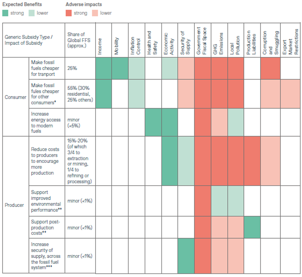 Expected Benefits and Adverse Impacts of Fossil Fuel Subsidies and Approximate Share of Global Fossil Fuel Subsidies