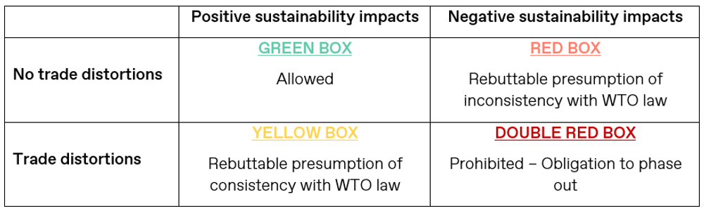 The green box encompasses subsidies with positive sustainability impacts and minimal trade distortions, intended to encourage sustainable development without hindering international trade. These subsidies should always be allowed, incentivizing governments to invest in sectors contributing to sustainable development. Subsidies that fall under the yellow box yield substantial sustainability gains but also notable trade distortions. They are granted a presumption of WTO rules consistency, subject to factors ensuring transparency, effectiveness in sustainability, absence of trade barriers, and proportionality. The red box includes all those subsidies that produce negative sustainability impacts without significant trade distortions. They are presumed inconsistent with WTO law, unless justified by overriding trade principles or domestic priorities, subject to a proportionality test. Finally, subsidies falling into the double red box cause both negative sustainability impacts and significant trade distortions. They are proposed for outright prohibition, with WTO members required to phase them out on a fixed schedule that reflects each country’s level of economic development. A safety valve allows countries to delay phase out by contributing to a Global Sustainability Transition Fund, aiming to provide financial assistance to developing nations for transitioning industries towards sustainability.