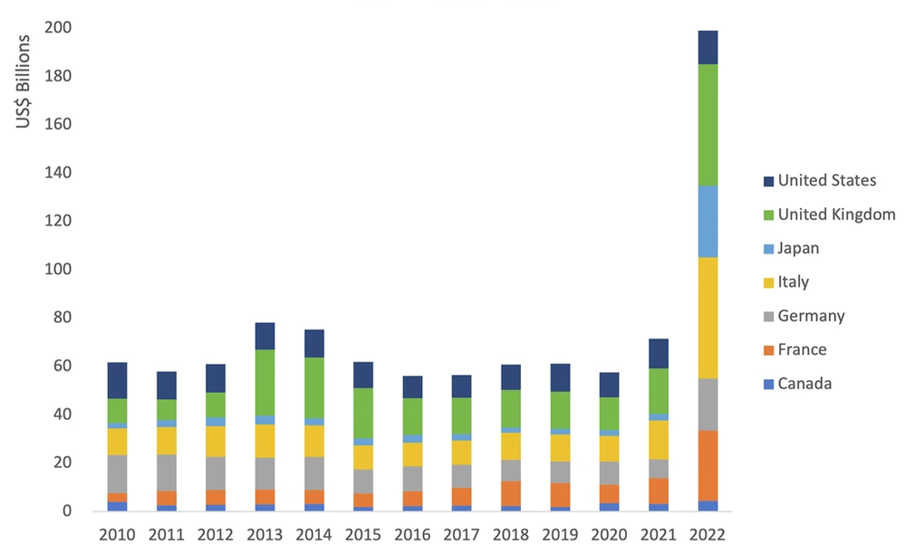 Source: Data taken from Fossil Fuel Subsidy Tracker (2024). Increases in 2022 were driven by increases in petroleum, fossil gas, and end-use electricity subsidies, especially in Italy, Japan, and the United Kingdom, underscoring the importance of the national context for these subsidies.
