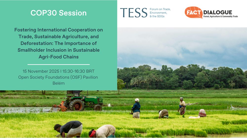 This session, organized by TESS and the FACT Dialogue, will convene government representatives, stakeholders, and experts from various regions to discuss pathways for international cooperation on inclusive, sustainable agri-food chains. It will highlight examples of collaboration involving government and non-government actors aimed at advancing the sustainable production, trade, and consumption of agricultural commodities (e.g. soy, beef, cocoa, coffee, timber, and oil palm) while ensuring smallholders are not left behind.