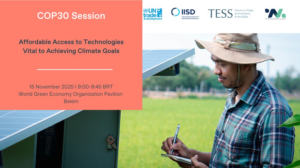 This session, organized by UNCTAD, IISD, TESS, and Youth Negotiators, will focus attention on the range of factors key to boosting access to affordable technologies, including the cost of capital, skills, regulatory environment, investment, trade policies, as well as the role that the private, public, academic sectors can play in supporting win-win solutions such as co-development, production, or partnerships on technology.