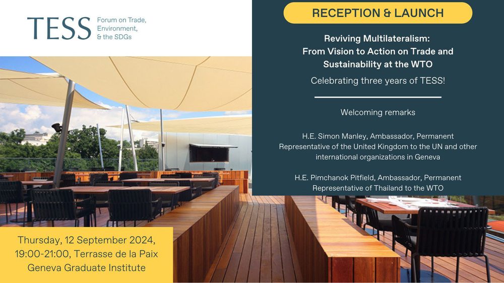 We celebrated three years of TESS! Since our creation, TESS has been fortunate to work across the trade, environment, and sustainable development communities with colleagues from around the world. This reception, hosted as part of Geneva Trade Week 2024, was our way of thanking and bringing together these communities in the margins of the WTO Public Forum.