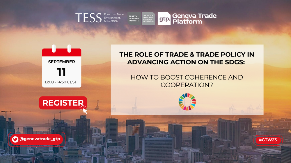 Alongside the WTO Public Forum, TESS collaborates each year with Geneva Trade Week, hosted by the Geneva Trade Platform at the Geneva Graduate Institute. We look forward to hosting a reception of trade and sustainability colleagues in Geneva for the WTO Public Forum, the high-level opening plenary of Geneva Trade Week on the role of trade and trade policy cooperation in advancing action on the Sustainable Development Goals (SDGs), as well as a breakfast bringing together invited climate and trade experts from around the world.