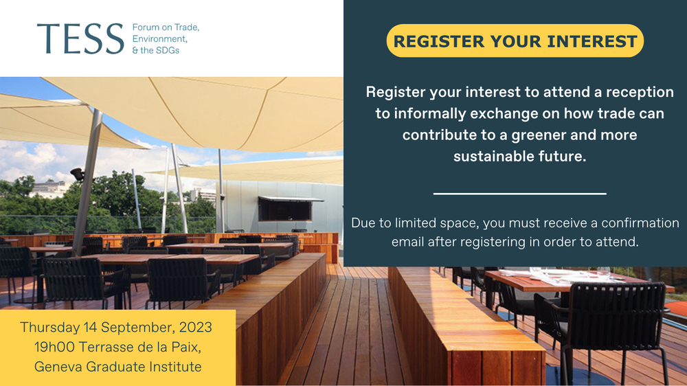 TESS invites you to join us for a reception at La Terrasse de la Paix at the Geneva Graduate Institute. Since its launch just over two years ago, TESS has been fortunate to work with colleagues from across the trade, environment, and sustainable development communities from around the world. The reception is our way of bringing this community together in the margins of the WTO Public Forum. To inspire conversation on how to advance inclusive cooperation on trade, climate, and sustainable development we look forward to welcoming the Trade Ministers of Ecuador and St. Vincent and the Grenadines as keynote speakers. Register your interest here.