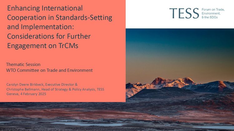 On 4 February 2025, the WTO Committee on Trade and Environment (CTE) held a fourth Thematic Session on the topic of “Trade-Related Climate Measures.” At the session, TESS was invited to contribute to the panel on “Enhancing International Cooperation in Standards Setting and Implementation” with a presentation on considerations for further engagement.
