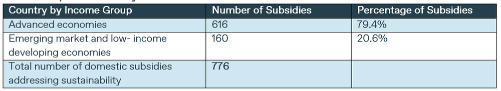 1. The majority of climate-related measures are subsidies to local firms, accounting for 54.6% of policy interventions supporting the transition to a low-carbon economy or involving low-carbon technologies. Table 1 illustrates that higher per capita-income economies (“advanced economies” in IMF parlance) award domestic subsidies more often than emerging and low-income developing countries.