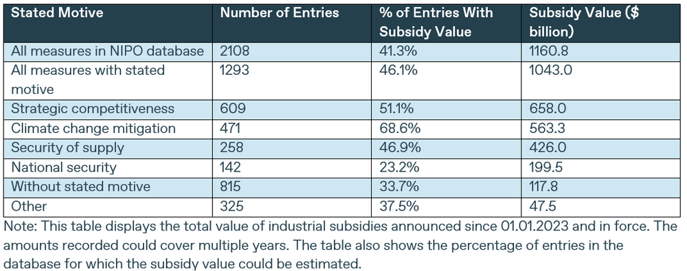 2. In spite of the increasing attention given to national security and geopolitical factors, state financial commitments to subsidies that address climate change were notably higher. The combined value of corporate subsidies associated with industrial policy measures announced since the beginning of 2023 total $1.1 trillion, with $563.3 billion specifically allocated to objectives related to climate change mitigation. Strategic competitiveness enhancements receive a higher financial allocation, surpassing subsidies dedicated to climate-related goals.